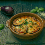 Roasted aubergine topped with rich tomato sauce and melted cheese, baked until golden and bubbly.